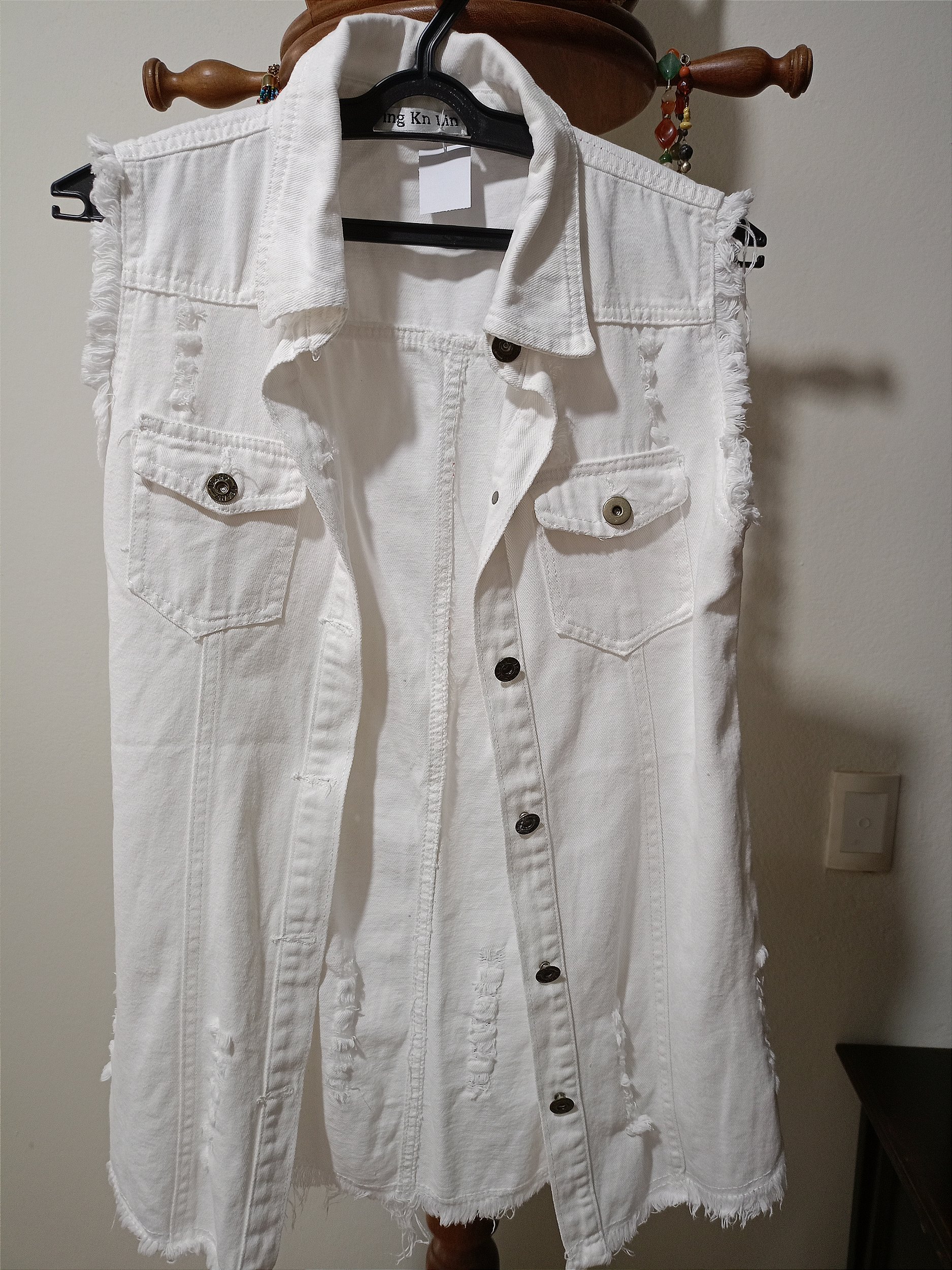 Colete Sarja Branco tamanho P. Detalhes desfiados.